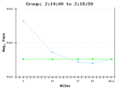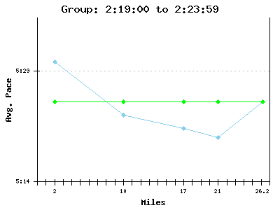 ------------------ 2:19:00 to 2:23:59 ------------------ 2m split avg: 5:30 10m split avg: 5:23 17m split avg: 5:21 21m split avg: 5:20 Overall pace: 5:25