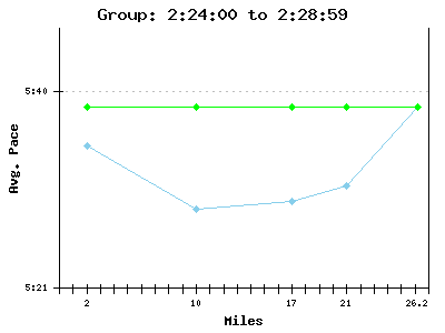 ------------------ 2:24:00 to 2:28:59 ------------------ 2m split avg: 5:32 10m split avg: 5:27 17m split avg: 5:28 21m split avg: 5:29 Overall pace: 5:35