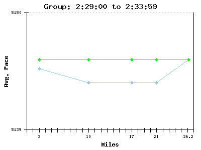------------------ 2:29:00 to 2:33:59 ------------------ 2m split avg: 5:47 10m split avg: 5:45 17m split avg: 5:45 21m split avg: 5:45 Overall pace: 5:48