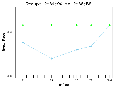 ------------------ 2:34:00 to 2:38:59 ------------------ 2m split avg: 5:54 10m split avg: 5:49 17m split avg: 5:52 21m split avg: 5:53 Overall pace: 6:00