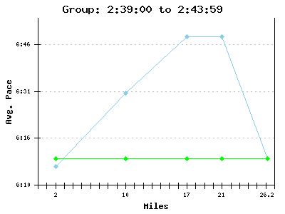 ------------------ 2:39:00 to 2:43:59 ------------------ 2m split avg: 6:07 10m split avg: 6:03 17m split avg: 6:05 21m split avg: 6:05 Overall pace: 6:09