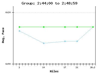 ------------------ 2:44:00 to 2:48:59 ------------------ 2m split avg: 6:19 10m split avg: 6:15 17m split avg: 6:16 21m split avg: 6:16 Overall pace: 6:20