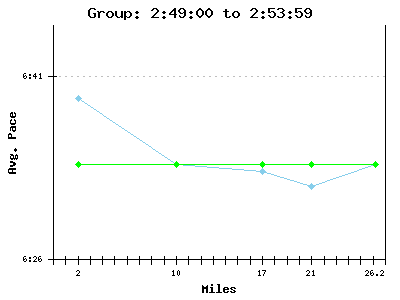 ------------------ 2:49:00 to 2:53:59 ------------------ 2m split avg: 6:39 10m split avg: 6:34 17m split avg: 6:33 21m split avg: 6:32 Overall pace: 6:34