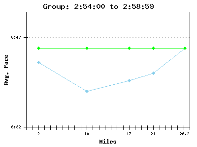 One thing that is noticable is that every single group was slower at the finish than at 21 miles. So if you’re planning on “picking it up” the last 10K, you won’t. The group closest at the finish to their 21 mile pace was the 2:49:00 to 2:53:59 group: