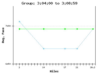------------------ 3:04:00 to 3:08:59 ------------------ 2m split avg: 7:11 10m split avg: 7:00 17m split avg: 7:00 21m split avg: 7:00 Overall pace: 7:08