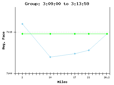 ------------------ 3:09:00 to 3:13:59 ------------------ 2m split avg: 7:22 10m split avg: 7:10 17m split avg: 7:11 21m split avg: 7:12 Overall pace: 7:18