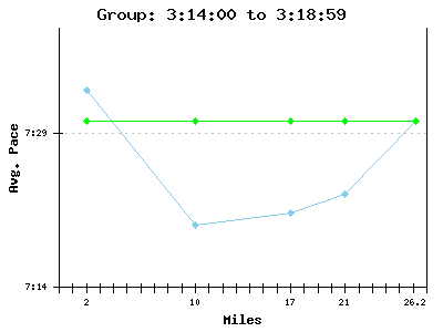 ------------------ 3:14:00 to 3:18:59 ------------------ 2m split avg: 7:33 10m split avg: 7:20 17m split avg: 7:21 21m split avg: 7:23 Overall pace: 7:30