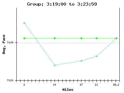 ------------------ 3:19:00 to 3:23:59 ------------------ 2m split avg: 7:47 10m split avg: 7:30 17m split avg: 7:32 21m split avg: 7:34 Overall pace: 7:41