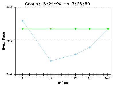 ------------------ 3:24:00 to 3:28:59 ------------------ 2m split avg: 7:58 10m split avg: 7:40 17m split avg: 7:43 21m split avg: 7:46 Overall pace: 7:54