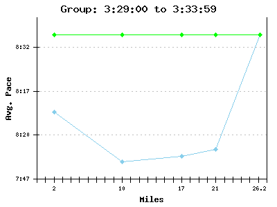 ------------------ 3:29:00 to 3:33:59 ------------------ 2m split avg: 8:10 10m split avg: 7:53 17m split avg: 7:55 21m split avg: 7:57 Overall pace: 8:04