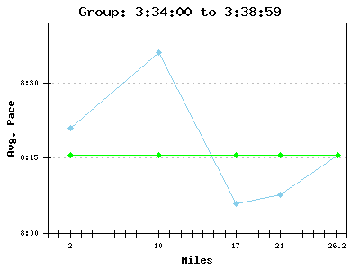 ------------------ 3:34:00 to 3:38:59 ------------------ 2m split avg: 8:21 10m split avg: 8:04 17m split avg: 8:06 21m split avg: 8:08 Overall pace: 8:16