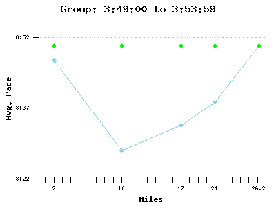 ------------------ 3:49:00 to 3:53:59 ------------------ 2m split avg: 8:47 10m split avg: 8:28 17m split avg: 8:33 21m split avg: 8:38 Overall pace: 8:50