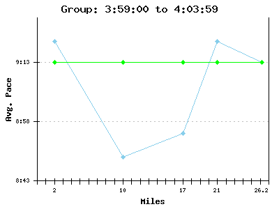------------------ 3:59:00 to 4:03:59 ------------------ 2m split avg: 9:02 10m split avg: 8:49 17m split avg: 8:55 21m split avg: 9:02 Overall pace: 9:13
