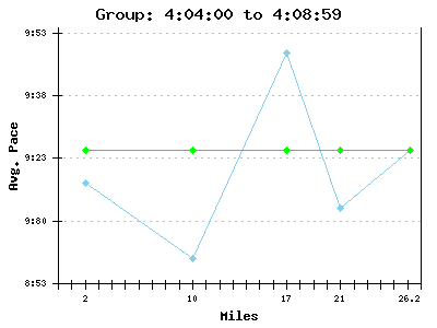 ------------------ 4:04:00 to 4:08:59 ------------------ 2m split avg: 9:17 10m split avg: 8:59 17m split avg: 9:05 21m split avg: 9:11 Overall pace: 9:25