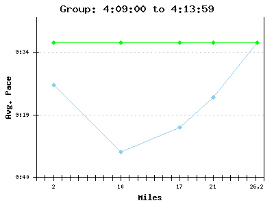 ------------------ 4:09:00 to 4:13:59 ------------------ 2m split avg: 9:26 10m split avg: 9:10 17m split avg: 9:16 21m split avg: 9:23 Overall pace: 9:36