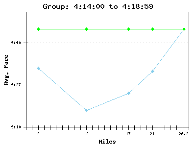 ------------------ 4:14:00 to 4:18:59 ------------------ 2m split avg: 9:33 10m split avg: 9:18 17m split avg: 9:24 21m split avg: 9:32 Overall pace: 9:47