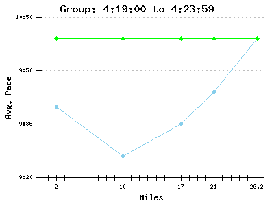 ------------------ 4:19:00 to 4:23:59 ------------------ 2m split avg: 9:40 10m split avg: 9:26 17m split avg: 9:35 21m split avg: 9:44 Overall pace: 9:59