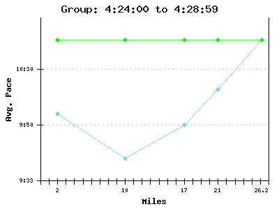 ------------------ 4:24:00 to 4:28:59 ------------------ 2m split avg: 9:51 10m split avg: 9:39 17m split avg: 9:48 21m split avg: 9:58 Overall pace: 10:11