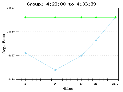 ------------------ 4:29:00 to 4:33:59 ------------------ 2m split avg: 9:59 10m split avg: 9:48 17m split avg: 9:57 21m split avg: 10:07 Overall pace: 10:21