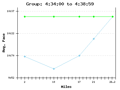 ------------------ 4:34:00 to 4:38:59 ------------------ 2m split avg: 10:06 10m split avg: 9:58 17m split avg: 10:07 21m split avg: 10:18 Overall pace: 10:33