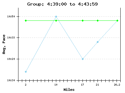 ------------------ 4:39:00 to 4:43:59 ------------------ 2m split avg: 10:09 10m split avg: 10:05 17m split avg: 10:18 21m split avg: 10:30 Overall pace: 10:45