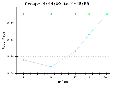 ------------------ 4:44:00 to 4:48:59 ------------------ 2m split avg: 10:15 10m split avg: 10:09 17m split avg: 10:23 21m split avg: 10:38 Overall pace: 10:56