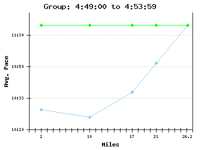 ------------------ 4:49:00 to 4:53:59 ------------------ 2m split avg: 10:28 10m split avg: 10:24 17m split avg: 10:36 21m split avg: 10:50 Overall pace: 11:08