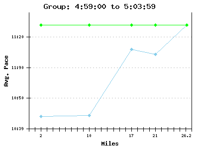 ------------------ 4:59:00 to 5:03:59 ------------------ 2m split avg: 10:45 10m split avg: 10:46 17m split avg: 11:02 21m split avg: 11:16 Overall pace: 11:30