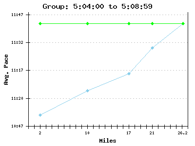 ------------------ 5:04:00 to 5:08:59 ------------------ 2m split avg: 10:53 10m split avg: 11:01 17m split avg: 11:15 21m split avg: 11:29 Overall pace: 11:42