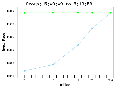 ------------------ 5:09:00 to 5:13:59 ------------------ 2m split avg: 10:46 10m split avg: 10:53 17m split avg: 11:16 21m split avg: 11:35 Overall pace: 11:53