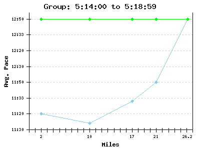 ------------------ 5:14:00 to 5:18:59 ------------------ 2m split avg: 11:02 10m split avg: 11:09 17m split avg: 11:30 21m split avg: 11:48 Overall pace: 12:05