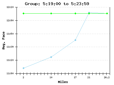 ------------------ 5:19:00 to 5:23:59 ------------------ 2m split avg: 11:15 10m split avg: 11:28 17m split avg: 11:47 21m split avg: 12:02 Overall pace: 12:17