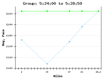 ------------------ 5:24:00 to 5:28:59 ------------------ 2m split avg: 11:05 10m split avg: 11:15 17m split avg: 11:46 21m split avg: 12:06 Overall pace: 12:28