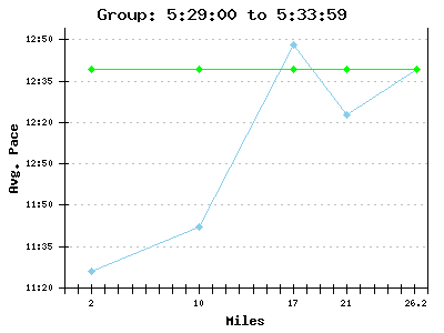 ------------------ 5:29:00 to 5:33:59 ------------------ 2m split avg: 11:26 10m split avg: 11:42 17m split avg: 12:05 21m split avg: 12:23 Overall pace: 12:39