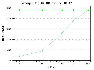 ------------------ 5:34:00 to 5:38:59 ------------------ 2m split avg: 11:45 10m split avg: 11:53 17m split avg: 12:19 21m split avg: 12:36 Overall pace: 12:51