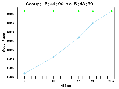 ------------------ 5:44:00 to 5:48:59 ------------------ 2m split avg: 11:29 10m split avg: 11:56 17m split avg: 12:29 21m split avg: 12:53 Overall pace: 13:13