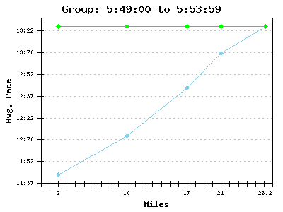 ------------------ 5:49:00 to 5:53:59 ------------------ 2m split avg: 11:43 10m split avg: 12:09 17m split avg: 12:43 21m split avg: 13:06 Overall pace: 13:25