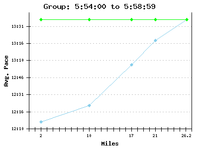 ------------------ 5:54:00 to 5:58:59 ------------------ 2m split avg: 12:07 10m split avg: 12:21 17m split avg: 12:57 21m split avg: 13:18 Overall pace: 13:37
