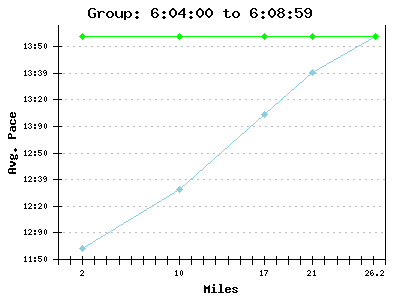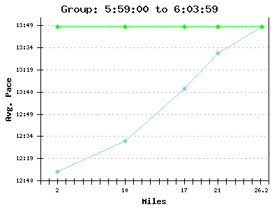 ------------------ 5:59:00 to 6:03:59 ------------------ 2m split avg: 12:10 10m split avg: 12:31 17m split avg: 13:06 21m split avg: 13:30 Overall pace: 13:48