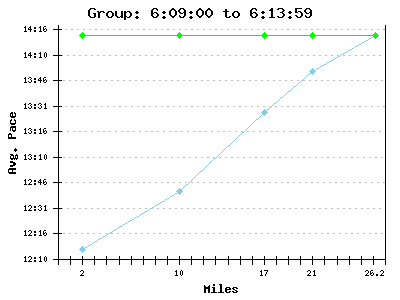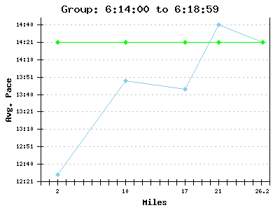 ------------------ 6:09:00 to 6:13:59 ------------------ 2m split avg: 12:07 10m split avg: 12:41 17m split avg: 13:27 21m split avg: 13:51 Overall pace: 14:12
