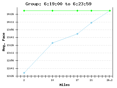 ------------------ 6:19:00 to 6:23:59 ------------------ 2m split avg: 12:32 10m split avg: 13:03 17m split avg: 13:48 21m split avg: 14:10 Overall pace: 14:33