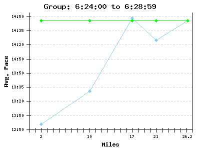 ------------------ 6:24:00 to 6:28:59 ------------------ 2m split avg: 12:56 10m split avg: 13:31 17m split avg: 14:05 21m split avg: 14:25 Overall pace: 14:46