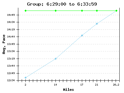 ------------------ 6:29:00 to 6:33:59 ------------------ 2m split avg: 12:40 10m split avg: 13:18 17m split avg: 14:06 21m split avg: 14:31 Overall pace: 14:57