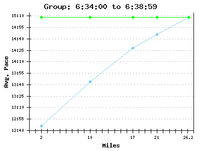 ------------------ 6:34:00 to 6:38:59 ------------------ 2m split avg: 12:46 10m split avg: 13:44 17m split avg: 14:28 21m split avg: 14:46 Overall pace: 15:08