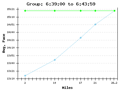 ------------------ 6:39:00 to 6:43:59 ------------------ 2m split avg: 13:12 10m split avg: 13:43 17m split avg: 14:26 21m split avg: 14:52 Overall pace: 15:18